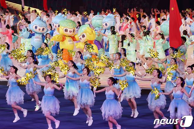 (항저우(중국)=뉴스1) 민경석 기자 = 23일 오후 중국 항저우 올림픽 스포츠센터 스타디움에서 열린 '2022 제19회 항저우 아시안게임' 개회식에서 축하 공연이 펼쳐지고 있다. 2023.9.23/뉴스1