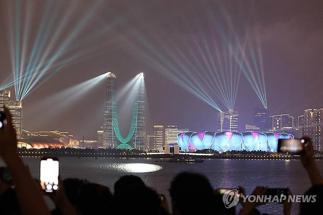 (항저우=연합뉴스) 형민우 기자 = 23일 오후 중국 항저우 항저우 올림픽 스포츠센터 스타디움에서 2022 항저우 아시안게임 개회식이 열려 화려한 라이트쇼가 펼쳐지고 있다. 2023.9.23