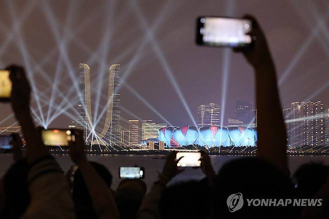 (항저우=연합뉴스) 형민우 기자 = 23일 오후 중국 항저우 항저우 올림픽 스포츠센터 스타디움에서 2022 항저우 아시안게임 개회식이 열려 화려한 라이트쇼가 펼쳐지고 있다. 2023.9.23