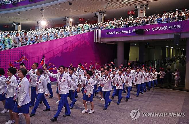 (항저우=연합뉴스) 류영석 기자 = 23일 오후 중국 항저우 올림픽 스포츠센터 스타디움에서 열린 2022 항저우 아시안게임 개회식에서 북한 선수단이 입장하고 있다. 2023.9.23
