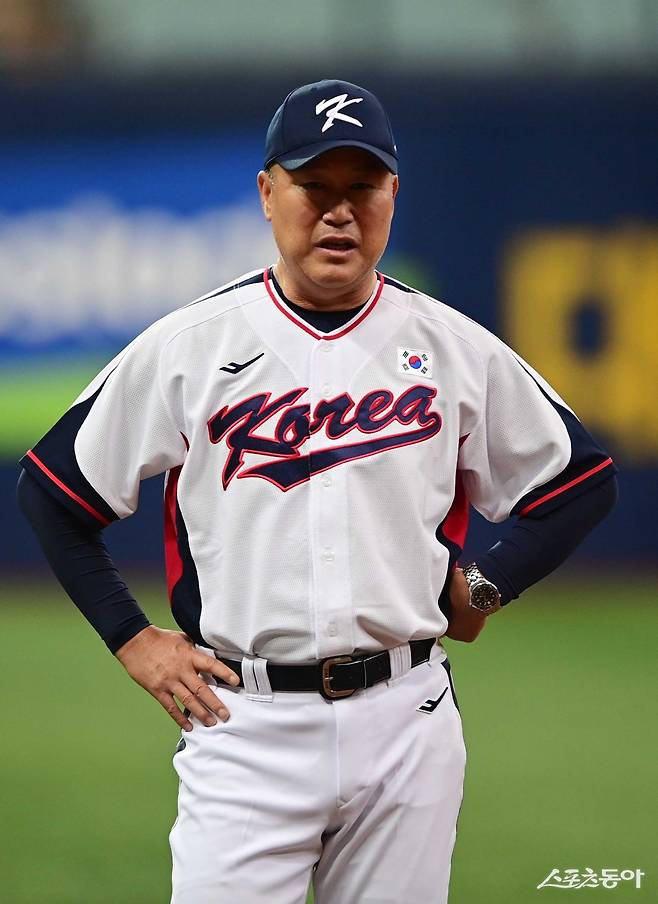23일 서울 고척스카이돔에서 ‘제19회 항저우 아시안게임’ 한국 야구대표팀 훈련이 열렸다. 한국 장종훈 코치가 선수들의 훈련을 지켜보고 있다.