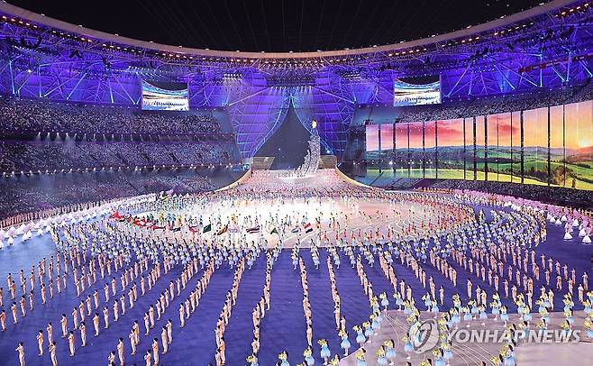 (항저우=연합뉴스) 김인철 기자 = 23일 오후 중국 항저우 올림픽 스포츠센터 스타디움에서 열린 2022 항저우 아시안게임 개회식에서 화려한 공연이 펼쳐지고 있다. 2023.9.24