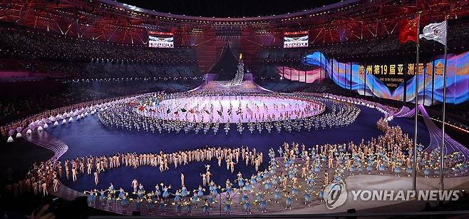 (항저우=연합뉴스) 김인철 기자 = 23일 오후 중국 항저우 올림픽 스포츠센터 스타디움에서 열린 2022 항저우 아시안게임 개회식에서 화려한 공연이 펼쳐지고 있다. 2023.9.24