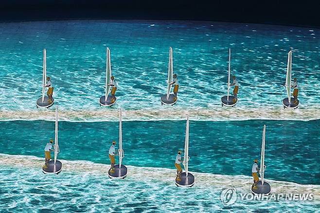 (항저우=연합뉴스) 신현우 기자 = 23일 오후 중국 항저우 올림픽 스포츠센터 스타디움에서 열린 2022 항저우 아시안게임 개회식에서 공연이 펼쳐지고 있다. 2023.9.24