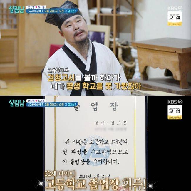 그러자 김봉곤은 “나는 (어렸을 때 집이) 산길, 오솔길이라서 부모님이 학교를 안 보냈다. 학교에 못 갔다. 내가 23살에 초등학교에 갔다”라고 밝혀 눈길을 끌었다. 이어 “초등학교를 안 받아준다. 초등학교 검정고시로 패스. 중학교를 패스했다. 공부를 하니까 검정고시를 볼까 하다가 학교를 못 가지 않았나. 방송통신고등학교가 있더라. 52살에 고등학교 졸업장을 받았다”라고 설명했다.
