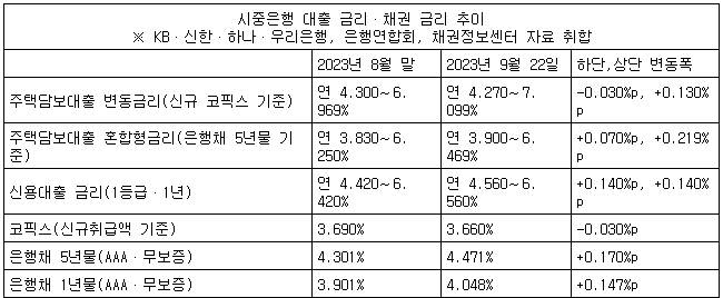 8월 말(연 3.830∼6.250%)과 비교해 이달 들어 상단이 0.219%포인트(p), 하단이 0.070%p 높아졌다.