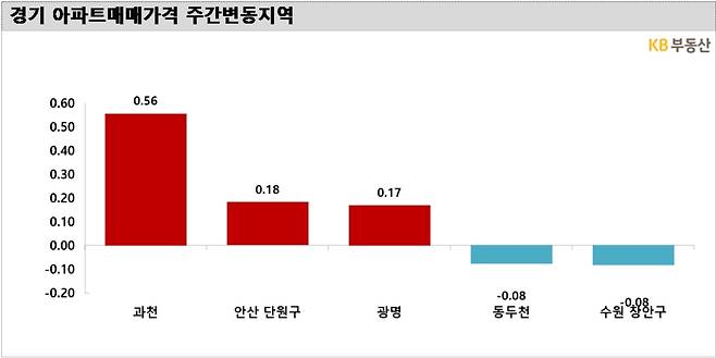과천 아파트 가격의 주간 상승률은 지난달 21일부터 0.55%→0.44%→0.66%→0.52%→0.56%로 꾸준히 높은 수준을 기록하고 있다.