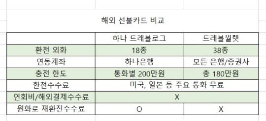 chapter3. 결제수수료 조차 없다…해외여행 선불카드 해외여행 선불카드의 최대 장점은 3無(연회비 X, 환전수수료X, 결제수수료X)이다. 트래블월렛, 트래블로그 등이 대표적인데, 필요한 금액을 모바일 앱에서 그때그때 충전해서 쓰는 방식이다. 앱에서 충전하고자 하는 통화와 금액을 선택/입력하면 실시간 환율을 반영해서 본인이 연동해놓은 은행 계좌에서 돈이 바로 빠져나가 충전이 되는 것이다. 이때 실물카드를 따로 발급받아 현지에서 체크카드처럼 이용하면 된다. 현지에서도 충전이 가능한 만큼, 갑자기 돈이 모자랄 걱정도 없다.