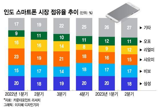 삼성이 샤오미를 제치고 1위를 지켰지만, 2분기 중국 스마트폰업체(샤오미, 비보, 오포, 리얼미)의 합계 점유율은 55%에 달할 정도로 높다. 다만 지난 2022년 1분기(63%) 이후 중국 스마트폰업체의 합계 점유율은 하락 추세를 벗어나지 못하고 있다. 인도 스마트폰 시장 성장 둔화와 인도 정부의 정책 영향이 크다.