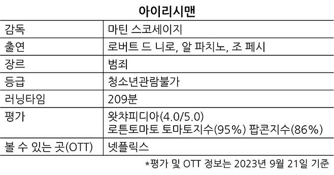 ![‘아이리시맨’ 포스터. 이 작품은 할리우드 마피아 영화 역사 그 자체를 되돌아보는 인상도 준다. 연출자 마틴 스코세이지 감독은 다수의 마피아 작품을 만들어왔을 뿐 아니라, 주연을 맡은 로버트 드 니로, 알 파치노, 조 페시는 미국 마피아 영화를 얘기할 때 빠지지 않는 배우들이다. [사진 제공=넷플릭스]](https://img4.daumcdn.net/thumb/R658x0.q70/?fname=https://t1.daumcdn.net/news/202309/24/mk/20230924081209789rhju.jpg)