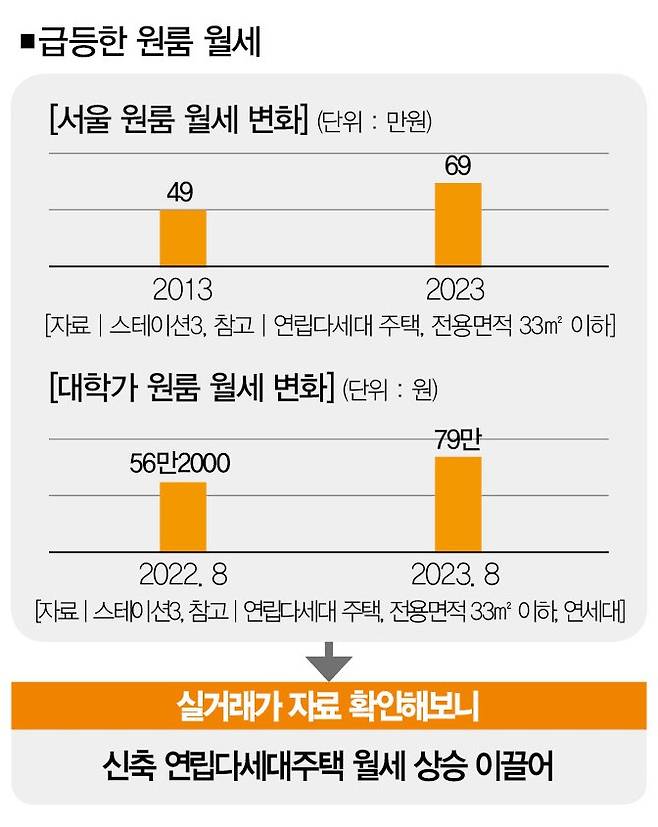 원룸 월세의 가파른 상승은 매매가 상승폭을 뛰어넘는다. 2020년부터 2023년까지 서울 연립ㆍ다세대주택 원룸(전용면적 33㎡ 이하) 월세 평균 상승률은 10.3%였다. 같은 기간 서울 연립 다세대주택(전용면적 33㎡ 이하) 매매가 평균 상승률은 9.6%로 월세 상승폭보다 작았다. 최근 4년간 매매가보다도 월세 부담이 더 무거웠다. 가파른 월세 상승폭은 2023년이 이끌었다. 2022년 56만원이었던 평균 월세는 2023년 69만원으로 23.2% 뛰었다.