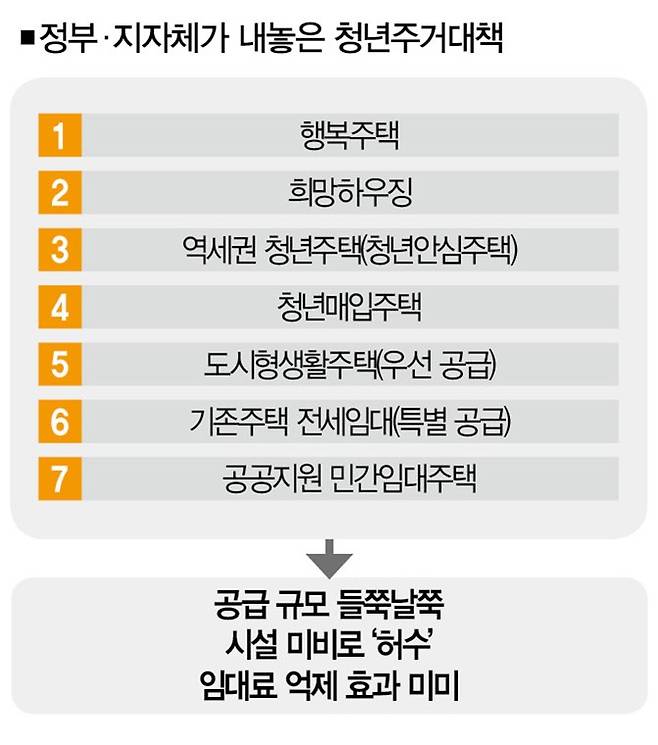 현재 운영하는 주거 대책은 서울을 기준으로 행복주택, 희망하우징, 역세권 청년주택(청년안심주택), 청년매입임대주택, 도시형생활주택(우선 공급), 기존주택 전세임대(특별공급), 공공지원민간임대주택 등 7개다. 금융 지원 정책은 제외하고 주택을 직접 제공하는 정책들인데, 그 효과를 하나씩 살펴보자.