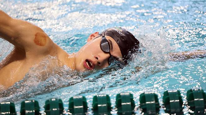 예선 마지막 조인 6조에서 5번 레인을 배정받아 4번 레인의 라이벌, 판자러의 바로 옆에서 레이스를 펼친 황선우는, 출발 총성과 함께 앞으로 치고 나간 뒤 단 한 번도 리드를 뺏기지 않고 판잔러보다 0.12초 먼저 터치패드를 찍어 기선을 제압했습니다.