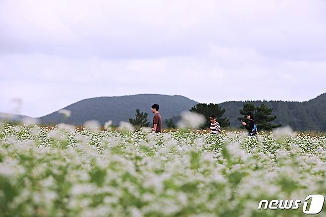 (제주=뉴스1) 강승남 기자 = 24일 오후 제주 서귀포시 표선면의 한 카페에 조성된 메밀밭을 관광객들이 거닐고 있다.2023.9.24/뉴스1