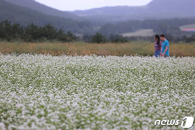 (제주=뉴스1) 강승남 기자 = 24일 오후 제주 서귀포시 표선면의 한 카페에 조성된 메밀밭을 관광객들이 거닐고 있다.2023.9.24/뉴스1