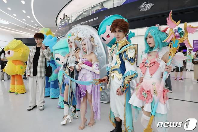 (항저우(중국)=뉴스1) 민경석 기자 = 24일 오전 중국 항저우 e스포츠센터에서 게임 팬들이 2022 항저우 아시안게임 공식 종목인 '아레나 오브 발러(왕자영요)' 속 캐릭터 코스튬 플레이어들과 기념촬영을 하고 있다. 2023.9.24/뉴스1