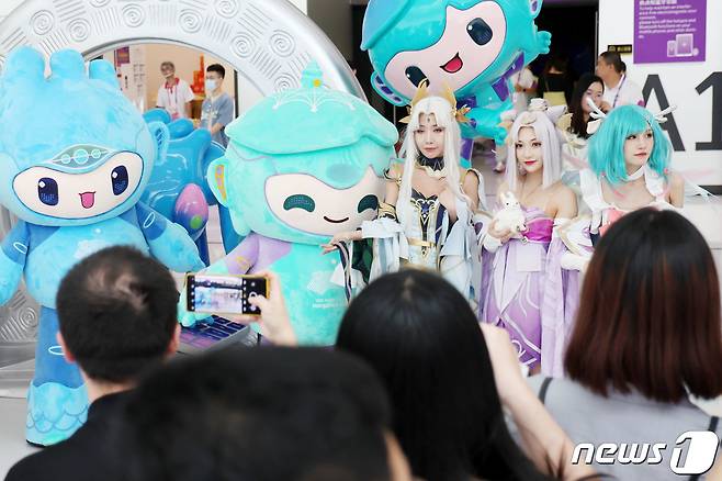 (항저우(중국)=뉴스1) 민경석 기자 = 24일 오전 중국 항저우 e스포츠센터에서 게임 팬들이 2022 항저우 아시안게임 공식 종목인 '아레나 오브 발러(왕자영요)' 속 캐릭터 코스튬 플레이어들과 기념촬영을 하고 있다. 2023.9.24/뉴스1