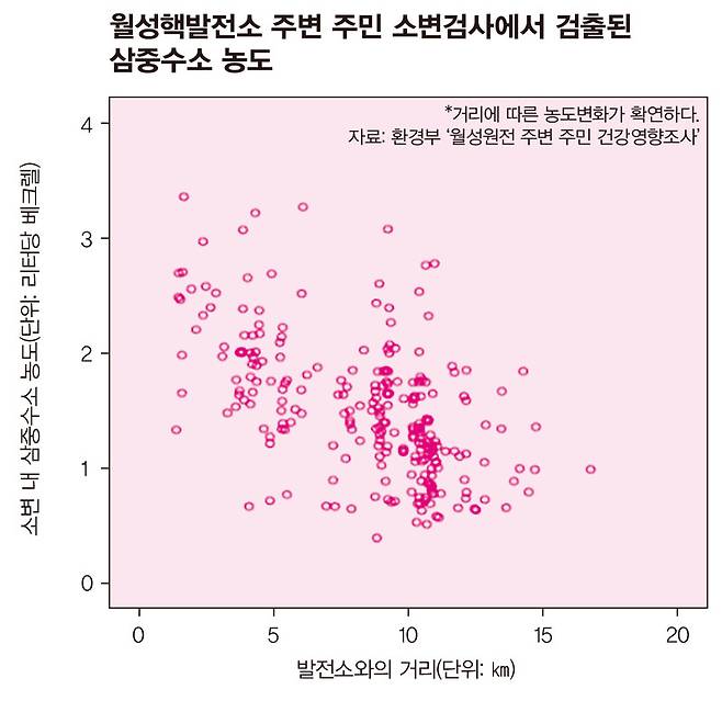 또 이 지역 주민 34명의 염색체 표본조사에서 절반에 가까운(47.1%) 16명이 염색체가 심각하게 손상돼 있었다. 환경부는 반경 10㎞ 이내 데이터를 발표하지 않은 이유로 ‘표본이 너무 적어 통계적 유의성이 없었다’고 했지만, ‘정부가 나서 핵산업계를 대변한다’는 비판이 나온다.