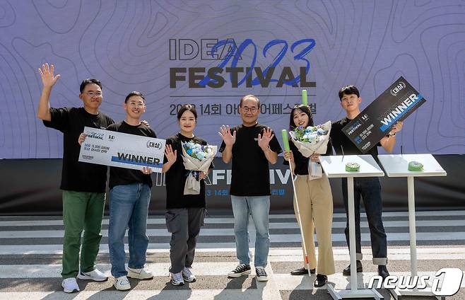 (서울=뉴스1) = 현대차·기아는 지난 22일 경기 화성 남양기술연구소에서 임직원들이 아이디어를 제안하고 실물을 직접 제작해 발표하는 ‘2023 아이디어 페스티벌’ 본선 경연을 진행했다고 밝혔다. 사진은 현대차·기아 CTO 김용화 사장과 대상 수상팀이 기념 촬영을 하는 모습. (현대차∙기아 제공) 2023.9.24/뉴스1