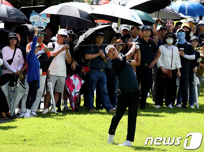 (서울=뉴스1) = 신상훈이 24일 경북 파미힐스CC에서 열린 'iM BANK 오픈' 파이널 라운드 3번홀에서 세컨샷을 하고 있다. (KPGA제공) 2023.9.24/뉴스1
