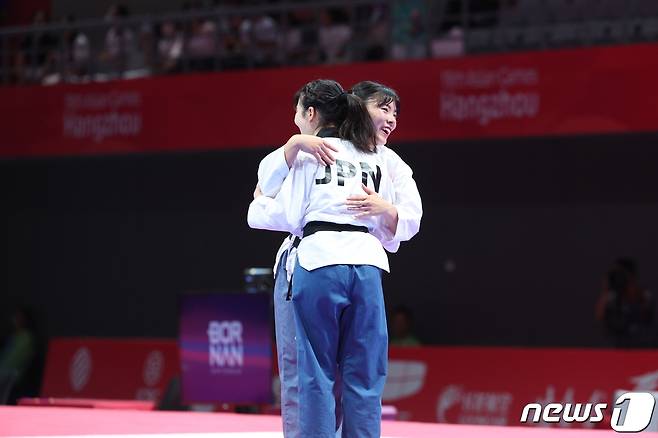 (항저우(중국)=뉴스1) 신웅수 기자 = 24일 오후 중국 항저우 린안 스포츠문화·전시센터에서 열린 2022 항저우 아시안게임 태권도 품새 여자 개인전 결승에서 차예은이 금메달을 확정지은 후 일본 니와 유이코를 안아주고 있다.