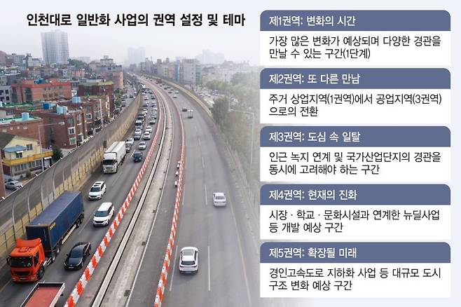 1권역(인하대병원 사거리∼주안산단고가교 4.8㎞)은 '변화의 시간'을 테마로 다양한 경관으로 조성돼 사업 전체 구간 중 가장 많은 변화가 예상된다. 2권역(주안산단고가교∼가정로98번길 인근 1.8㎞)은 '또 다른 만남'을, 3권역(가좌IC 인근 0.4㎞)은 '도심 속 일탈'을 테마로 개발된다.