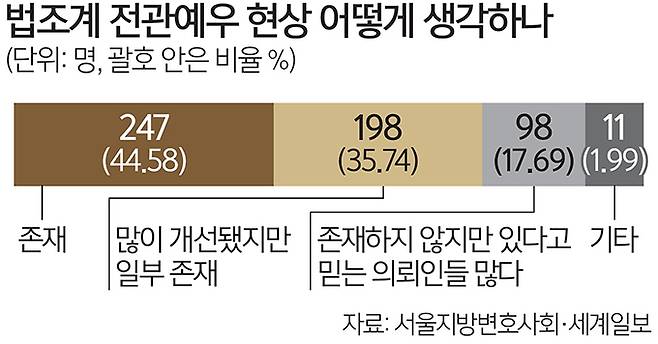 법조계 전관예우 현상에 대한 질문엔 ‘존재한다’(247명·44.58%), ‘많이 개선됐지만 일부 존재한다’(198명·35.74%)는 답변이 80%를 넘었다. 나머지(98명·17.69%)는 ‘존재하지 않지만 있다고 믿는 의뢰인들이 많다’고 했다. 이 같은 양상은 사건 수임에 어려움을 겪는 청년 변호사들이 조사에 많이 참여한 점과 무관하지 않은 것으로 추정된다.