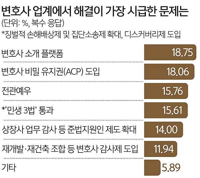 변호사들은 업계 현안으로 로톡 사태로 대표되는 ‘변호사 소개 플랫폼’ 문제 해결이 가장 시급하다고 지적했다.