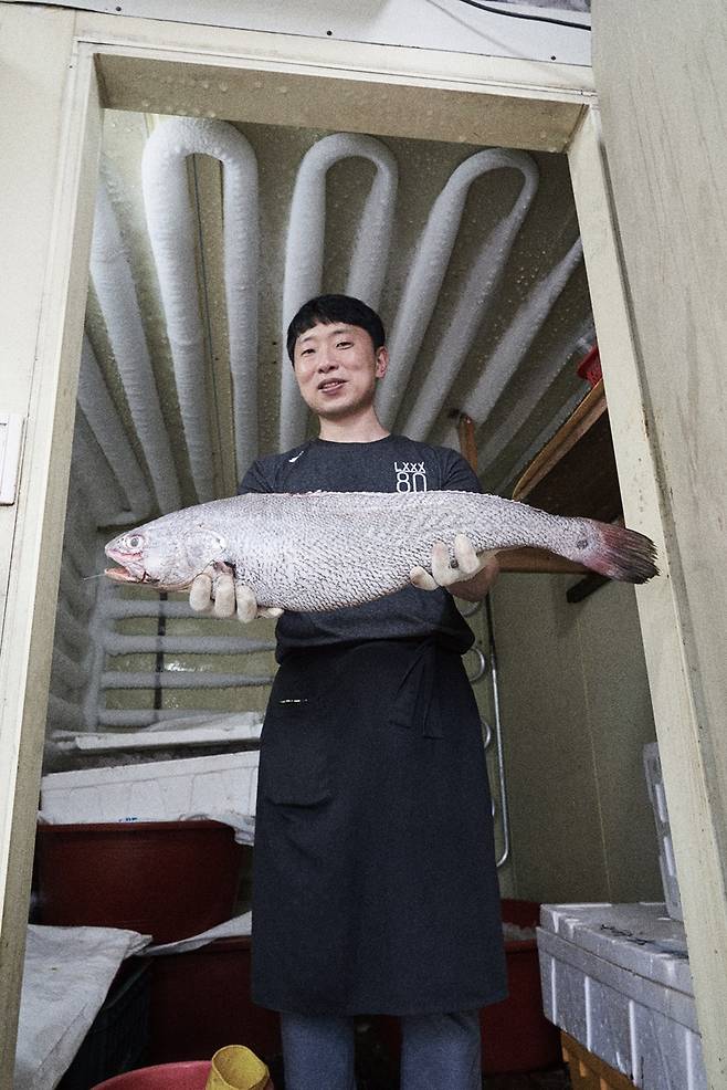 | ▲ 신포시장 민어 골목 ‘경남횟집’의 제형남 대표. 숙성시킨 민어를 손에 들고 있다. |