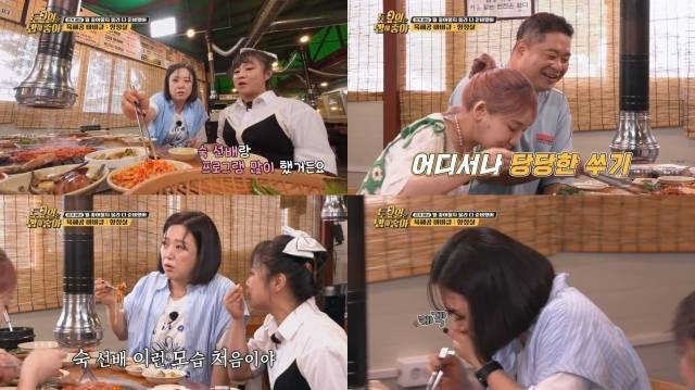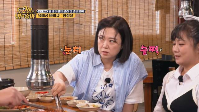 현주엽이 더덕에 정신이 팔린 사이 김숙은 그의 눈치를 살피며 더덕 구이와 콩나물 무침을 슬쩍 불판에 올렸다. 이를 귀신같이 캐치한 박나래는 "나는 숙 선배랑 프로그램을 엄청 많이 했다. 어떤 프로를 가도 눈치를 보는 스타일이 아니다"라며 "본인이 하고자 하는 건 그대로 하는 사람이다. 이렇게 눈치 보는 프로그램 처음 봤다"라며 폭로했다.