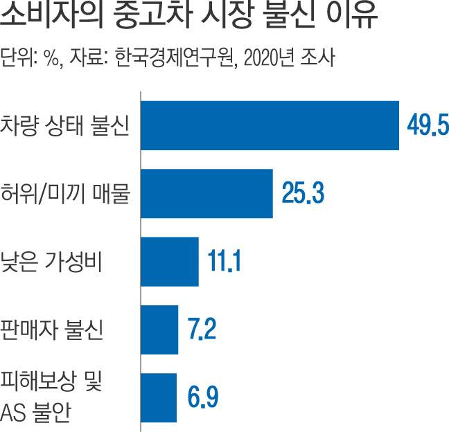 실제로 한국경제연구원이 2020년 진행한 설문조사에서 소비자들은 중고차 시장을 불신하는 이유에 대해 ‘차량 상태를 믿을 수 없다(49.5%)’는 답이 최다였다. 허위 미끼 매물(25.3%), 낮은 가성비(11.1%), 판매자 불신(7.2%), 판매 후 피해보상 및 AS 불안(6.9%) 등을 이유로 든 이들도 많았다.