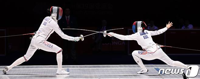(항저우(중국)=뉴스1) 유승관 기자 = 최인정(왼쪽)과 송세라가 24일 중국 항저우 디안즈대학에서 열린 2022 항저우 아시안게임 펜싱 여자 에페 결승에서 치열한 승부를 펼치고 있다.