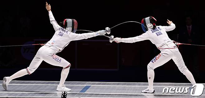 (항저우(중국)=뉴스1) 유승관 기자 = 최인정(왼쪽)과 송세라가 24일 중국 항저우 디안즈대학에서 열린 2022 항저우 아시안게임 펜싱 여자 에페 결승에서 치열한 승부를 펼치고 있다.