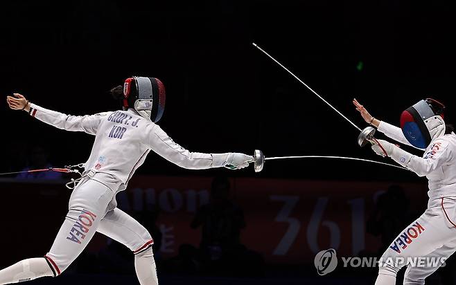 (항저우=연합뉴스) 신현우 기자 = 24일 중국 항저우 전자대학 체육관에서 열린 항저우 아시안게임 여자 에페 개인전 결승에서 최인정과 송세라가 경기를 펼치고 있다. 2023.9.24