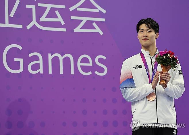 (항저우=연합뉴스) 박동주 기자 = 대한민국 황선우가 24일 중국 항저우 올림픽 스포츠센터 수영장에서 열린 항저우 아시안게임 남자 자유형 100m 결승에서 동메달을 획득한 황선우가 박수를 치고 있다. 2023.9.24