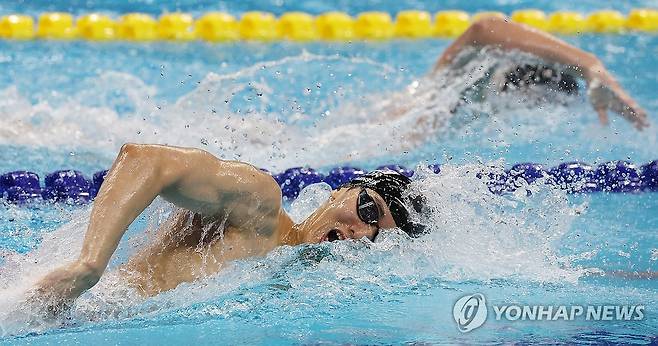 (항저우=연합뉴스) 박동주 기자 = 대한민국 김민석이 24일 중국 항저우 올림픽 스포츠센터 수영장에서 열린 항저우 아시안게임 남자 개인 혼영 200m 결승에서 역영하고 있다. 2023.9.24