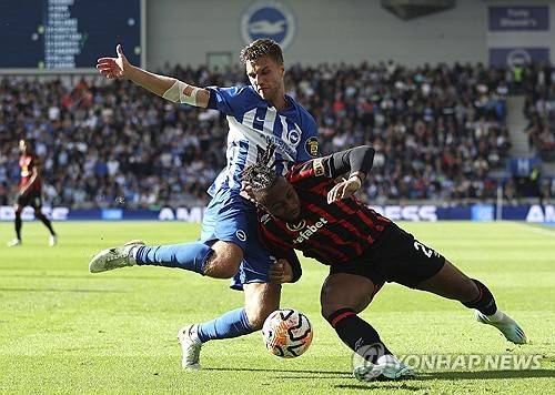 Brighton and Hove Albion's Joel Veltman challenges Bournemouth's Antoine Semenyo, right, during the English Premier League soccer match between Brighton and Hove Albion and Bournemouth at the AMEX Stadium, Brighton, England,: Sunday Sept. 24, 2023. (Steven Paston/PA via AP) UNITED KINGDOM OUT; NO SALES; NO ARCHIVE; PHOTOGRAPH MAY NOT BE STORED OR USED FOR MORE THAN 14 DAYS AFTER THE DAY OF TRANSMISSION; MANDATORY CREDIT