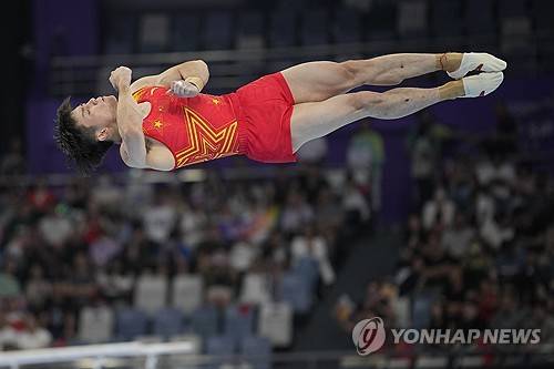 China's Lin Chaopan compete at the floor exercises during the men's team artistic gymnastics event of the 19th Asian Games in Hangzhou, China, Sunday, Sept. 24, 2023. (AP Photo/Aaron Favila)