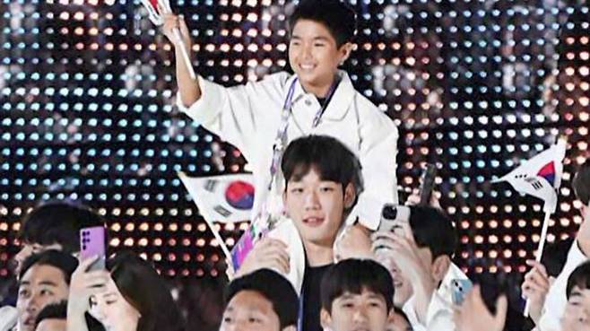 어제(23일) 개회식에서 우리 선수단 입장 때 이 장면이 화제가 됐습니다. 12살 스케이트보드 대표 문강호 군을 2m가 넘는 장신 농구 선수가 목말을 태워 입장한 건데요.