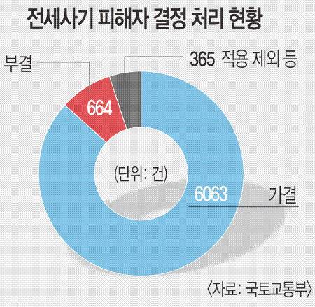 24일 국토교통부에 따르면 전세사기 피해지원회는 지난 20일까지 10차례 회의를 열고 7092건의 전세사기 피해자를 심의했다. 전세사기 피해자로 결정된 건수는 6063건으로 85.5%에 달한다. 부결된 경우는 664건(9.4%)이었다. 보증보험에 가입돼 있거나 최우선변제금 등으로 보증금 전액 반환이 가능해 요건 적용 대상에서 제외된 경우는 365건(5.1%)으로 집계됐다.