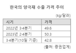 올해 3·4분기 한국의 양극재 수출 가격이 직전분기 대비 15% 이상 하락하면서 배터리 소재 업계 한숨도 깊어지고 있다.