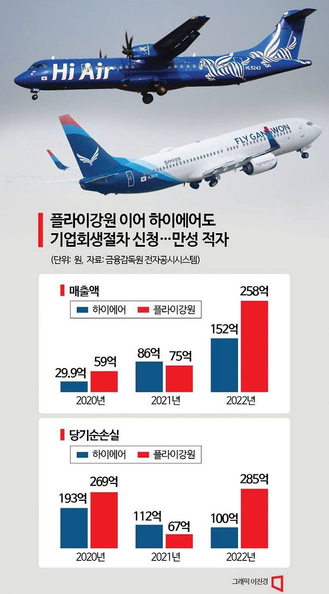 이같은 절차를 밟은 LCC가 또 있다. 지난 6월 서울회생법원 14부가 플라이강원 회생절차 개시 사실을 고지했다. 공개경쟁입찰 방식으로 10월에 새 주인을 찾는다. 당초 우선협상대상자를 선정하는 ‘스토킹 호스’ 방식으로 매각을 추진했으나 인수자를 찾지 못했다. 이 회사도 만성 적자에 시달렸다. 2020년부터 지난해까지 매출은 59억원에서 258억원으로 5배 뛰었다. 하지만 매년 적자에 시달렸다. 2020년 당기순손실 269억원, 2021년 67억원, 지난해 285억원을 기록했다.