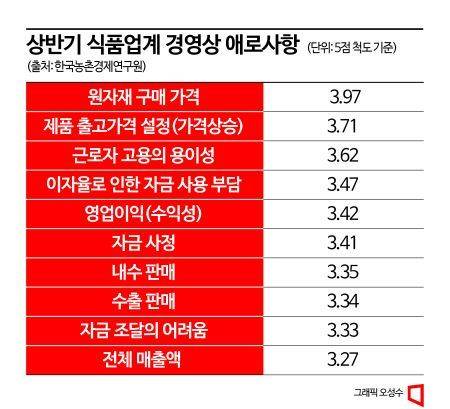 25일 한국농촌경제연구원이 국내 식품업체 및 식품연구소 관리자급 153명을 대상으로 상반기 경영상 애로사항을 조사한 결과, 원자재 구매 가격 상승으로 인한 어려움이 5점 척도 기준 3.97점으로 가장 높게 집계됐고, 이로 인한 제품의 출고 가격 상승이 3.71점으로 뒤를 이었다.