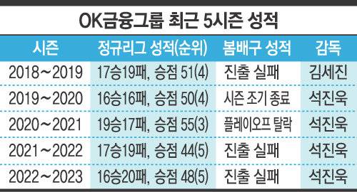 OK금융그룹은 2022~2023시즌 16승20패, 승점 48로 정규리그 5위에 머물렀다. 2013~2014시즌 V리그 입성 후 2014~2015시즌과 2015~2016시즌에 2시즌 연속 챔피언결정전 정상에 올랐지만, 이후 2020~2021시즌 3위를 제외하면 봄배구는 다른 세상의 이야기였다. 그러나 오기노 감독 선임 후 아직까진 순조롭게 정규리그 개막 준비를 하고 있다. 8월 KOVO컵에서 사상 첫 정상에 오르며 올 시즌 반란을 예고했다.