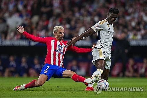 Atletico Madrid's Antoine Griezmann, left, vies for the ball with Real Madrid's Aurelien Tchouameni during the Spanish La Liga soccer match between Atletico Madrid and Real Madrid at Metropolitan stadium in Madrid, Sunday, Sept. 24, 2023. Atletico Madrid won 3-1. (AP Photo/Manu Fernandez)