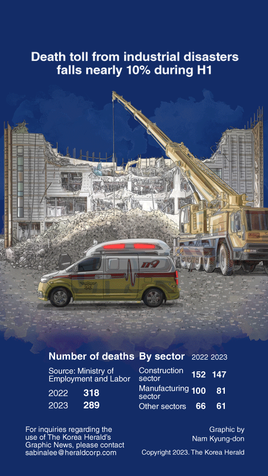 A total of 289 workers died from January to June, marking a drop of 9.1 percent, or 29 people, from 318 on-duty deaths of workers in the previous year, according to the Ministry of Employment and Labor.