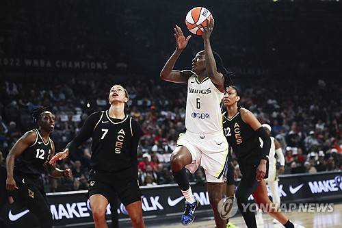 Dallas Wings forward Natasha Howard (6) shoots over Las Vegas Aces forward Alysha Clark (7) during the first half in Game 1 of a WNBA basketball semifinal series, Sunday, Sept. 24, 2023, in Las Vegas. (Wade Vandervort/Las Vegas Sun via AP) MANDATORY CREDIT; LAS VEGAS REVIEW-JOURNAL OUT