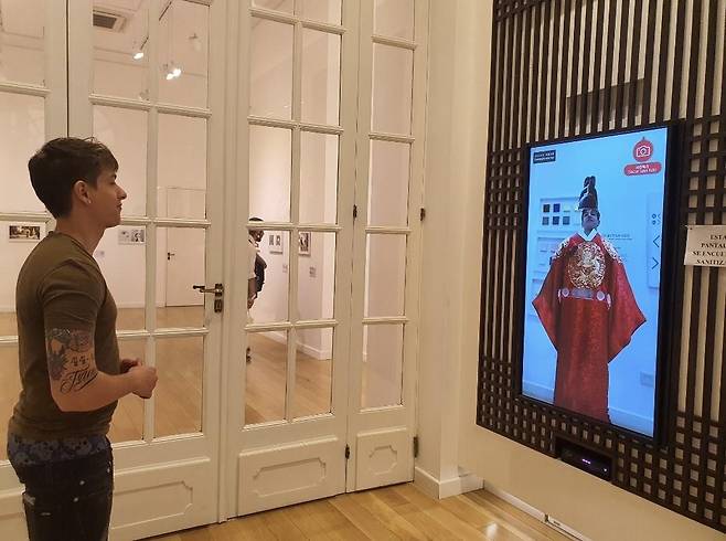 (부에노스아이레스=연합뉴스) 김선정 통신원 = 지난 23일 아르헨티나 부에노스아이레스 주아르헨티나 한국문화원에서 열린 '박물관의 밤' 행사에서 한 시민이 디지털 한복 입기 체험을 하고 있다. 2023.9.25