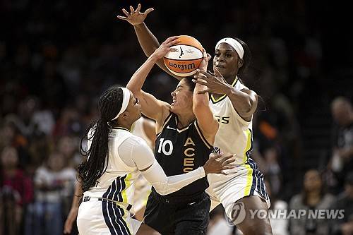 Las Vegas Aces guard Kelsey Plum (10) is pressured by Dallas Wings guard Odyssey Sims, left, and center Kalani Brown, right, during the first half in Game 1 of a WNBA basketball semifinal series Sunday, Sept. 24, 2023, in Las Vegas. (Ellen Schmidt/Las Vegas Review-Journal via AP) MANDATORY CREDIT; LAS VEGAS SUN OUT; ALSO OUT: KSNV, KVVU, KLAS, KLVX, KTNV, KVCW, KINC, KBLR, NEWS3LV.COM, KTNV.COM, LASVEGASNOW.COM, LASVEGASWEEKLY.COM, FOX5VEGAS.COM, LASVEGAS, CBSLOCAL.COM; NO LICENSING EXCEPT BY AP COOPERATIVE MEMBERS