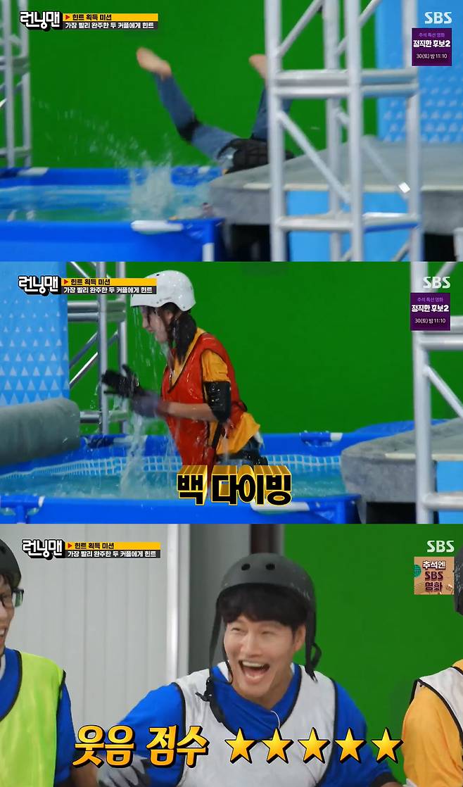 허리 아픈 하하를 대신해 양세찬과 커플 게임을 펼친 송지효는 밧줄을 타고 물장애물을 건너야 하는 코너에서 계속 도전하다 결국 힘이 빠져 마지막에 백다이빙으로 물에 떨어지는 모습을 선보였다.